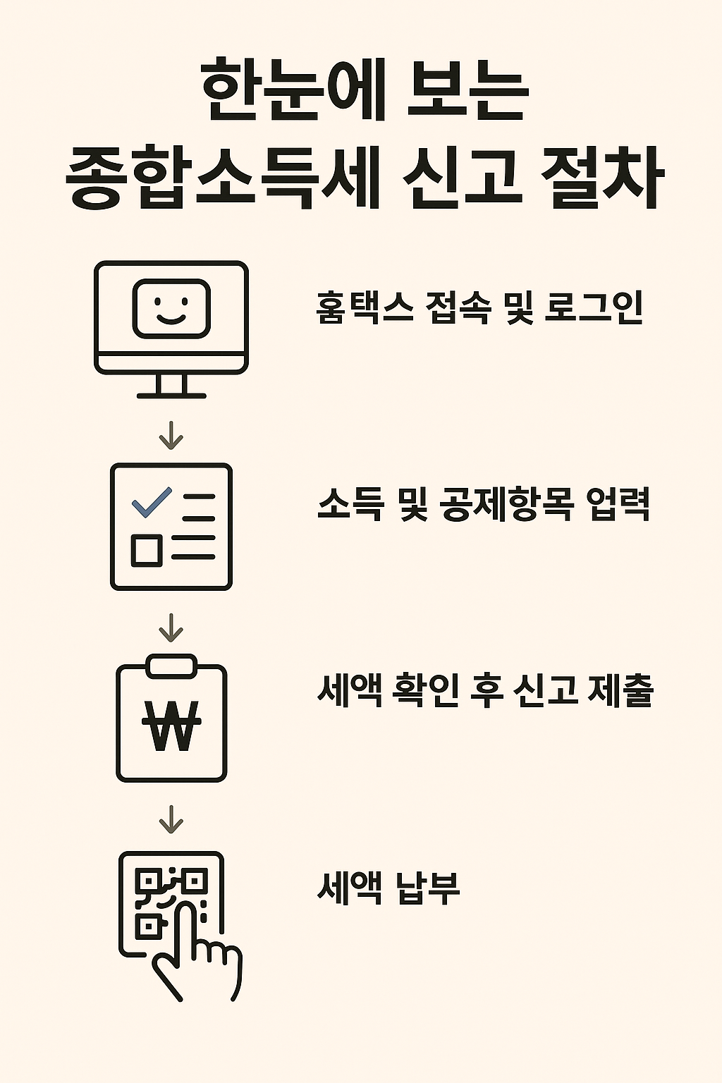 2025년 종합소득세 신고는 미리 준비하면 결코 어렵지 않습니다. 자신의 소득 종류를 정확히 파악하고, 필요한 공제 서류를 꼼꼼히 챙긴 후 홈택스 등을 통해 차근차근 진행하면 됩니다.