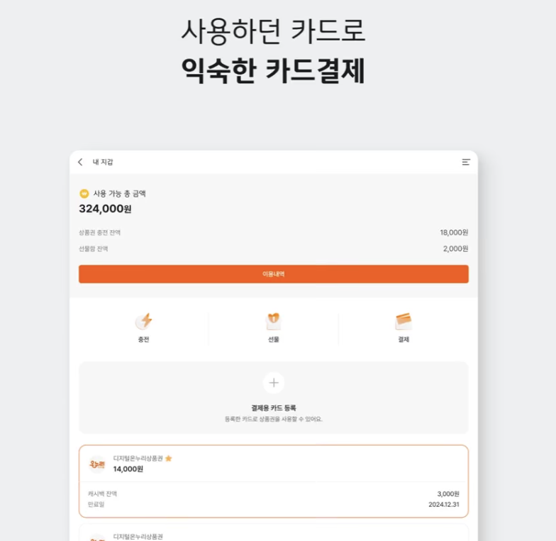 기존 종이 상품권과 다르게 앱에 연결된 카드 또는 스마트폰의 앱으로 결제합니다.