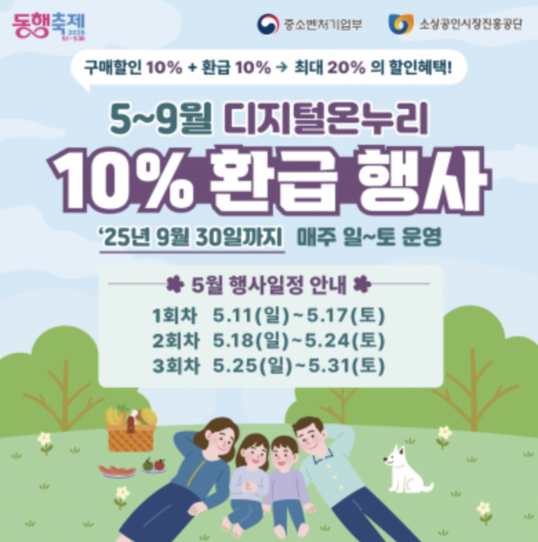 중소벤처기업부는 2025년 5월 11일부터 9월 30일까지 약 5개월간, 전통시장이나 골목상권에서 디지털 온누리상품권으로 결제하면 결제액의 10%를 환급해주는 행사를 진행합니다.