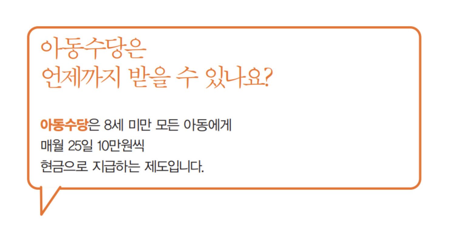 → 해당 날짜가 주말이나 공휴일인 경우, 앞당겨 지급됨 - 지급 기간: 출생한 달부터 만 8세 생일 전날까지 지급
