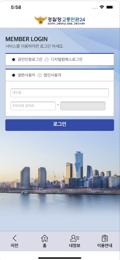 1. 공식 홈페이지나 교통민원24 앱 접속, 간편인증으로 로그인