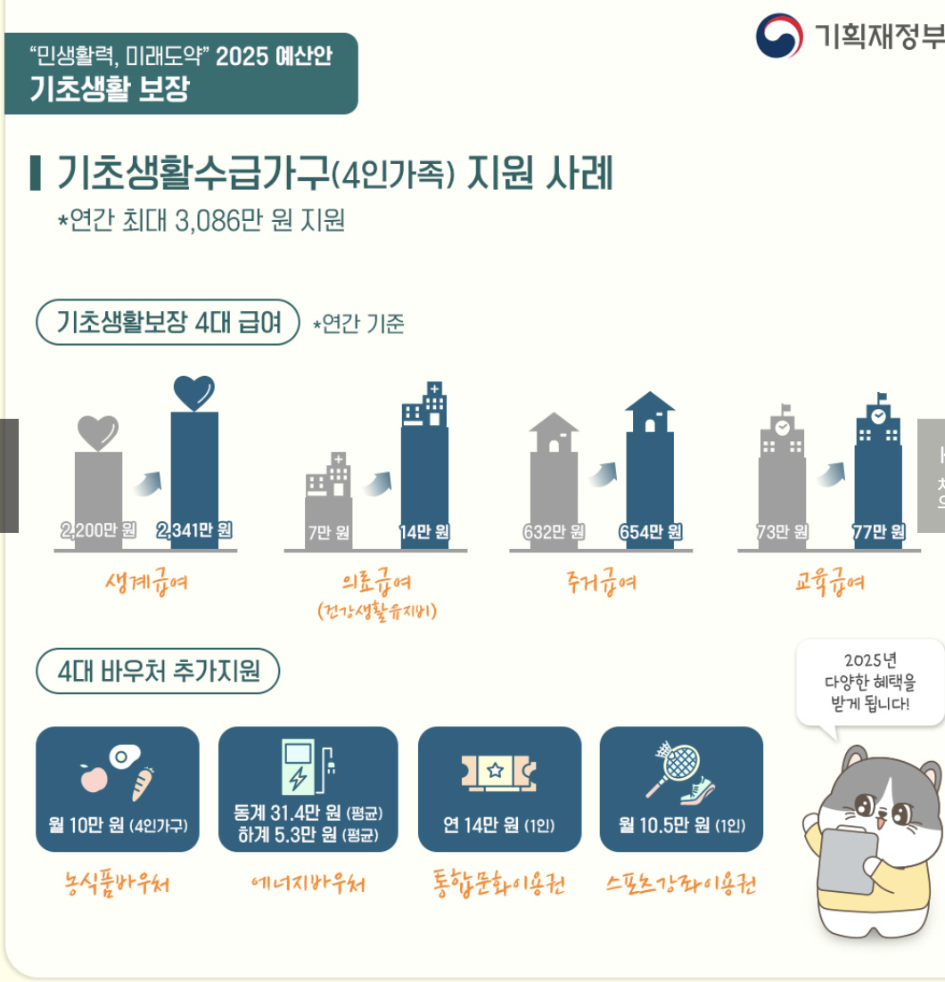 이럴 때 정부의 제도적 지원은 큰 힘이 됩니다. 그중 하나가 바로 기초생활수급자 생계급여입니다.