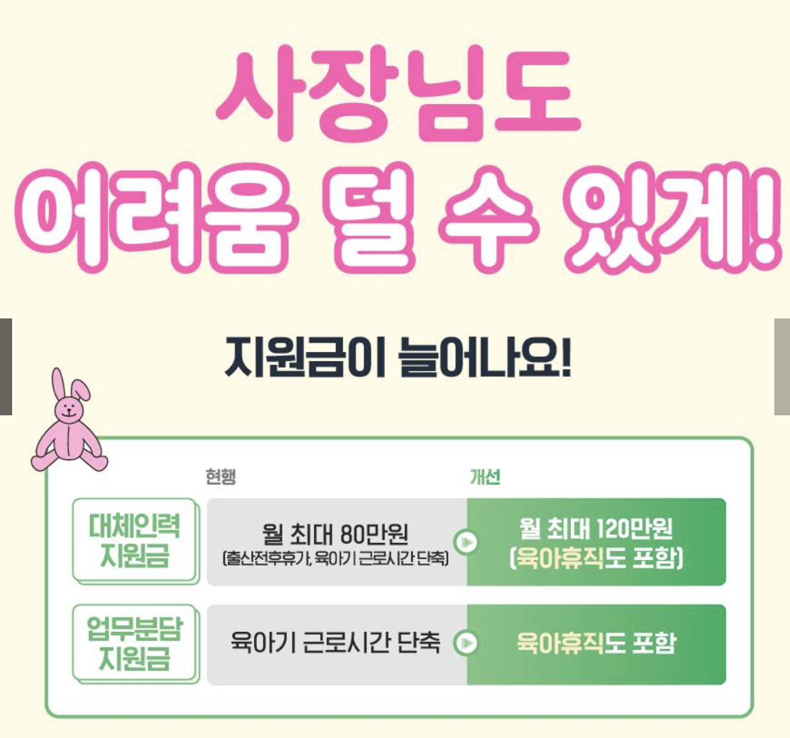 2024년부터는‘부모 함께 육아휴직제’가 시행되어, 생후 18개월 이하 자녀에 대해 부모가 동시에 육아휴직을 쓰는 경우, 육아휴직 첫 6개월간 육아휴직급여를 인상하여 지급합니다.