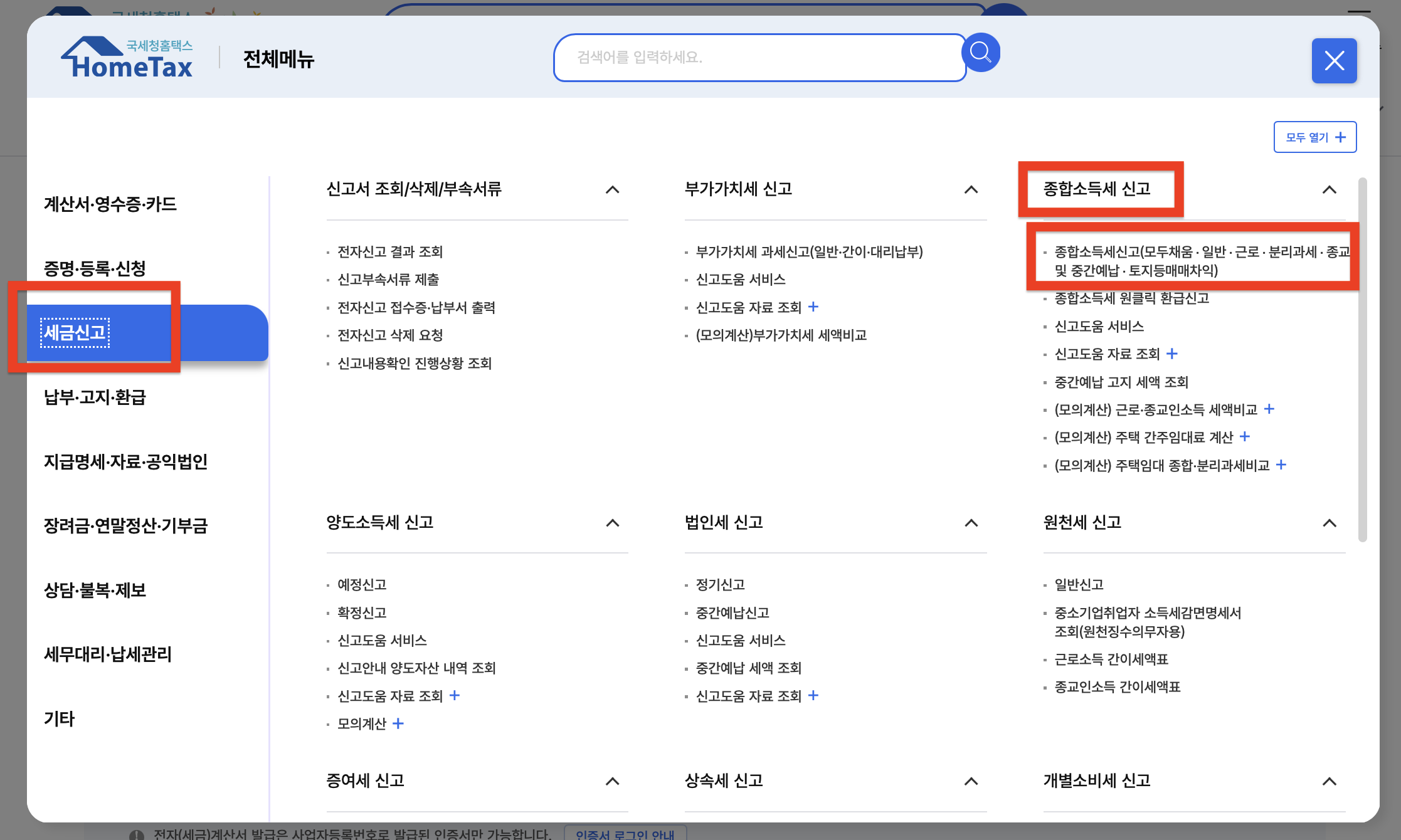 - 메인 화면에서 [세금신고] 선택