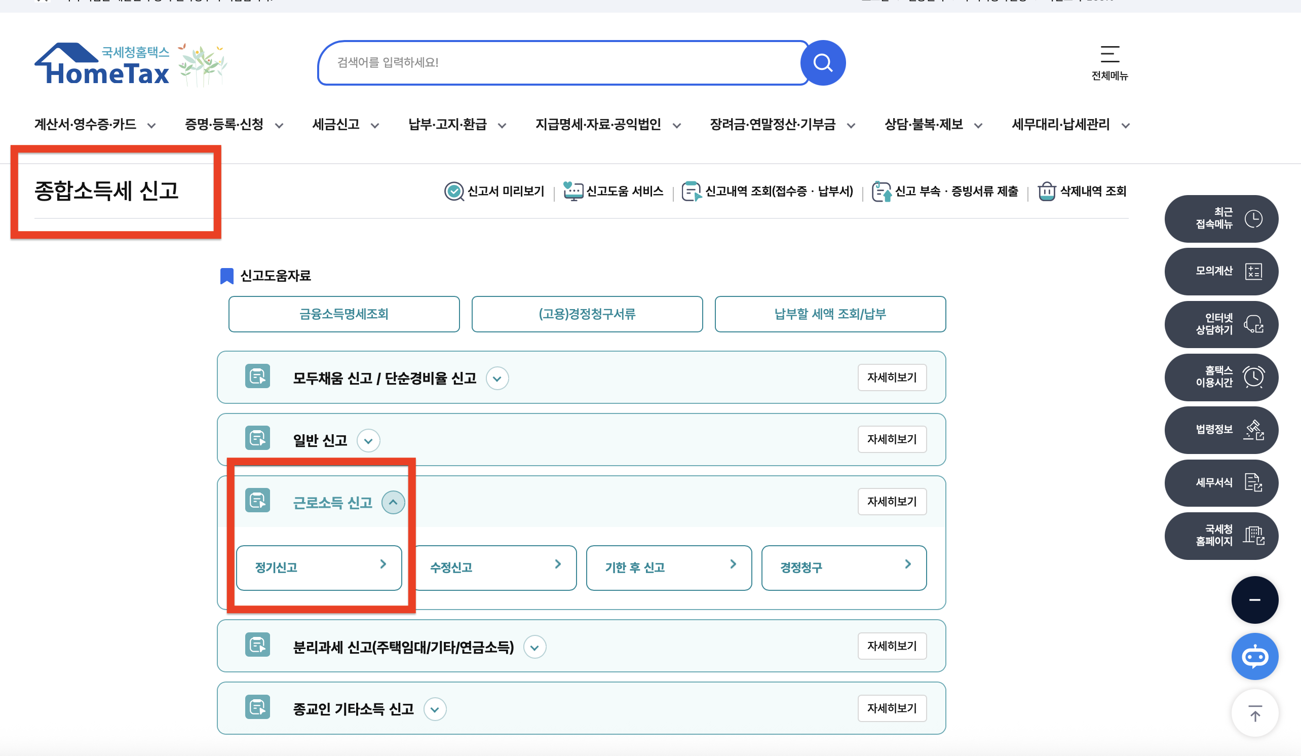 - [종합소득세] → [근로소득 신고서 작성] 선택
