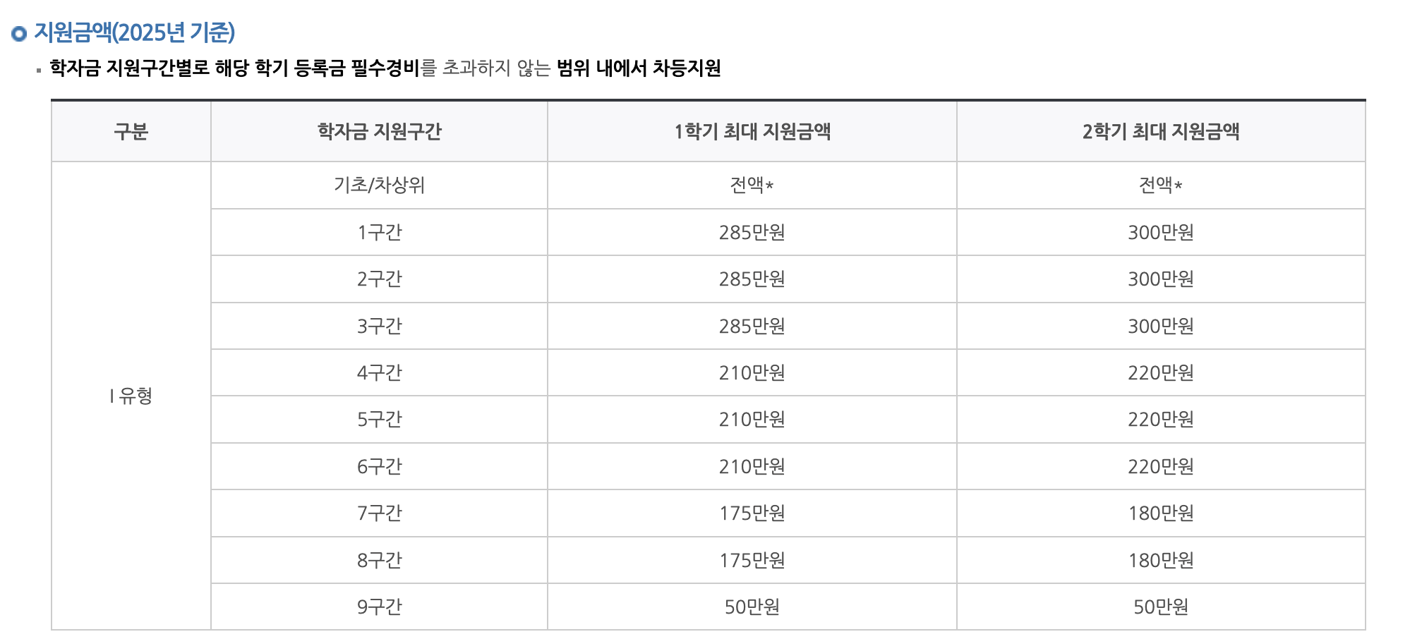 아래는 2025년도 기준으로 예상되는 국가장학금 I유형 지급 금액입니다. (II유형은 대학별 자율 지급이라 미포함)