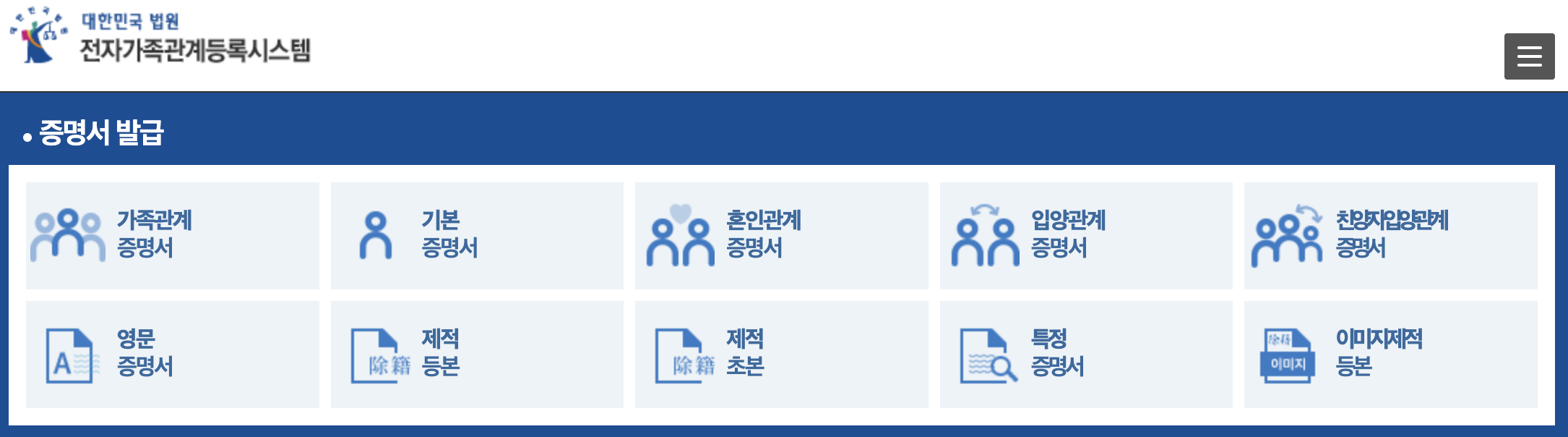 - 홈페이지 상단 메뉴에서 [가족관계등록부 발급]을 선택하세요.