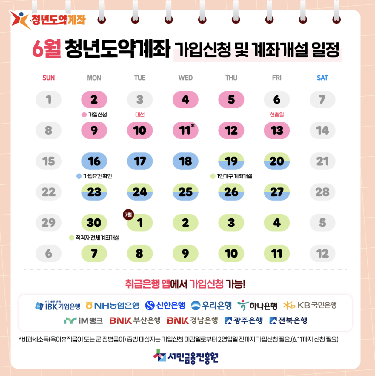 계좌 개설은 신청자격 확인 후, 1인 가구는 6월 19일(목)부터 7월 11일(금)까지, 2인 이상 가구는 6월 30일(월)부터 7월 11일(금)까지 진행됩니다.