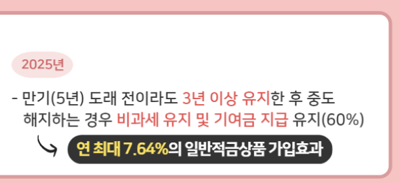 - 금융소득종합과세: 가입일이 속한 과세기간의 직전 3개 과세기간 중 1회 이상 금융소득종합과세 대상자에 해당하지 않아야 함