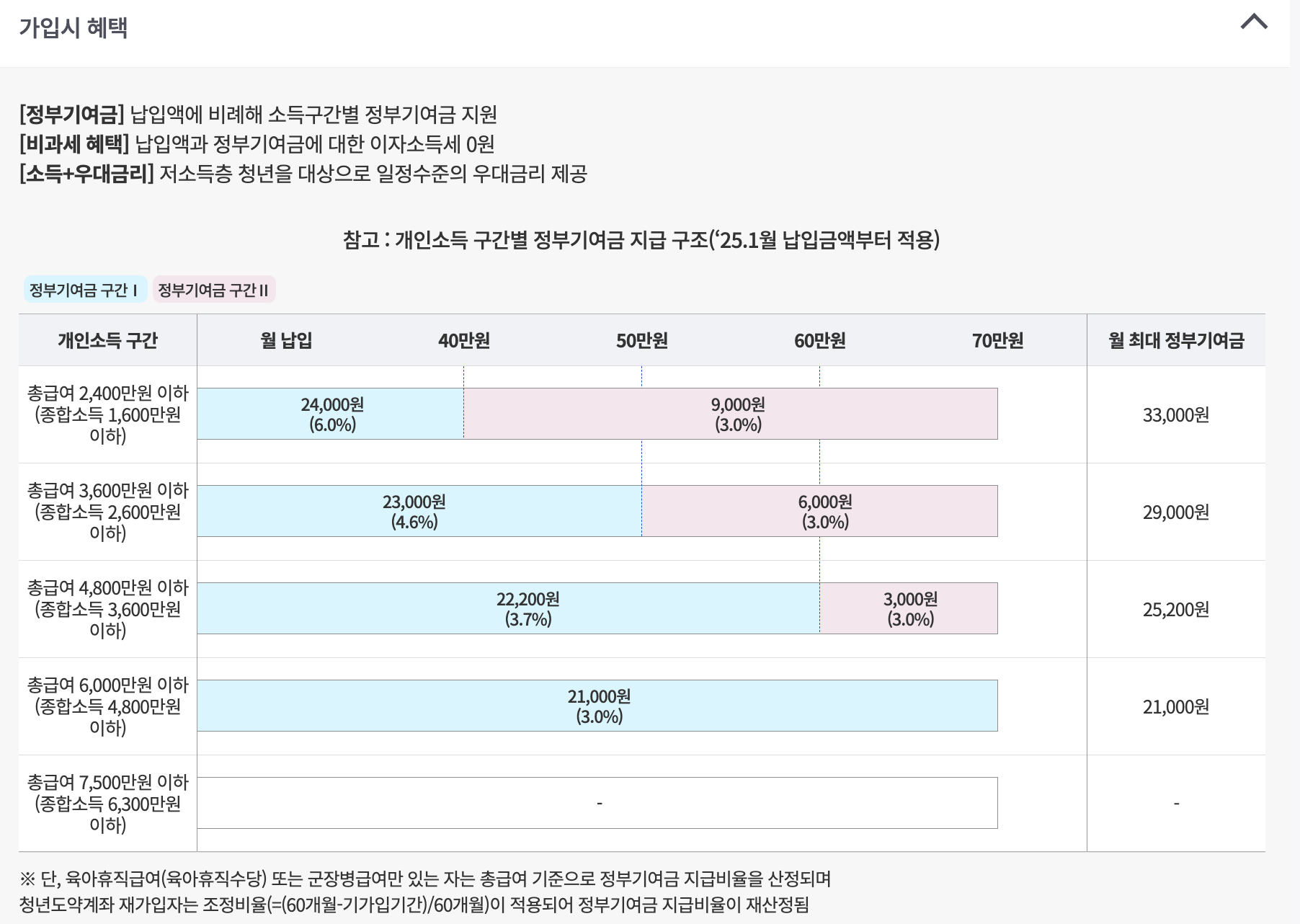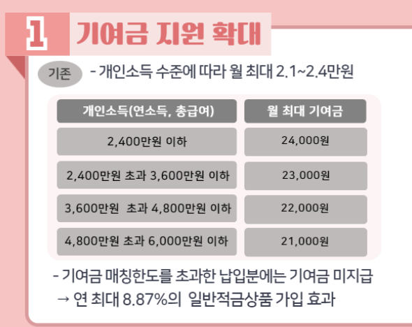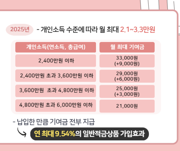 - 정부기여금: 개인소득 구간에 따라 매월 최대 33,000원까지 지원