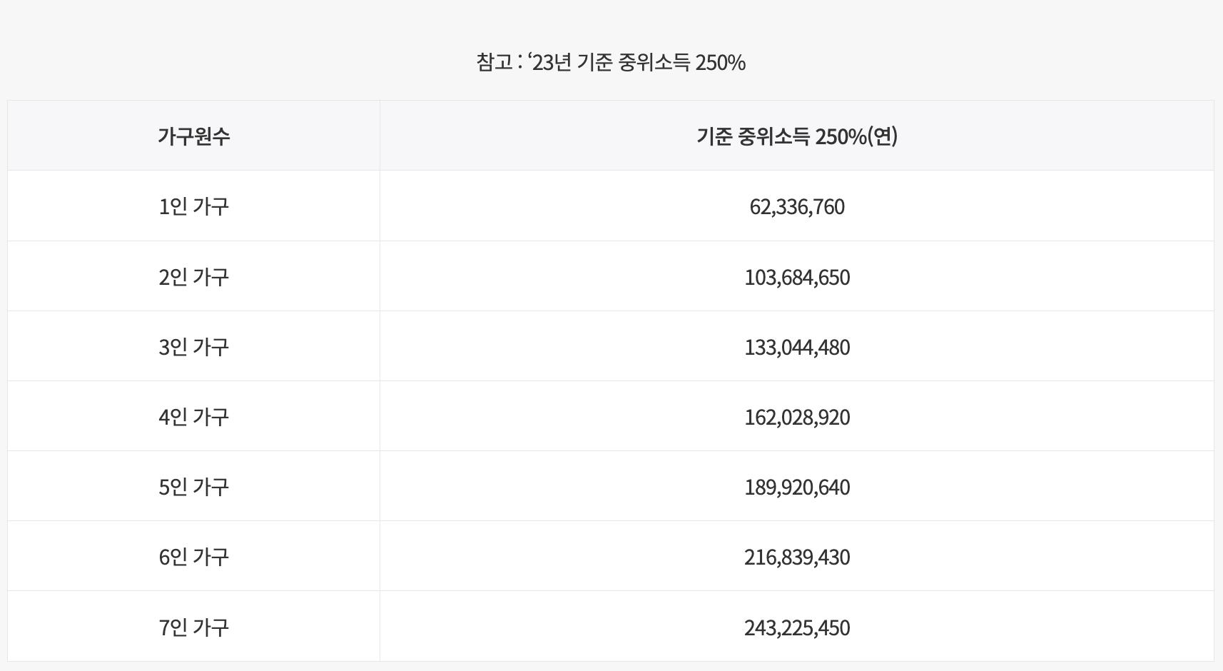 - 가구소득: 가구원 수에 따른 기준 중위소득 250% 이하