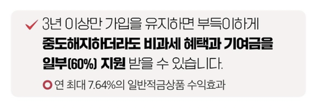 - 비과세 혜택: 납입액과 정부기여금에 대한 이자소득세 면제