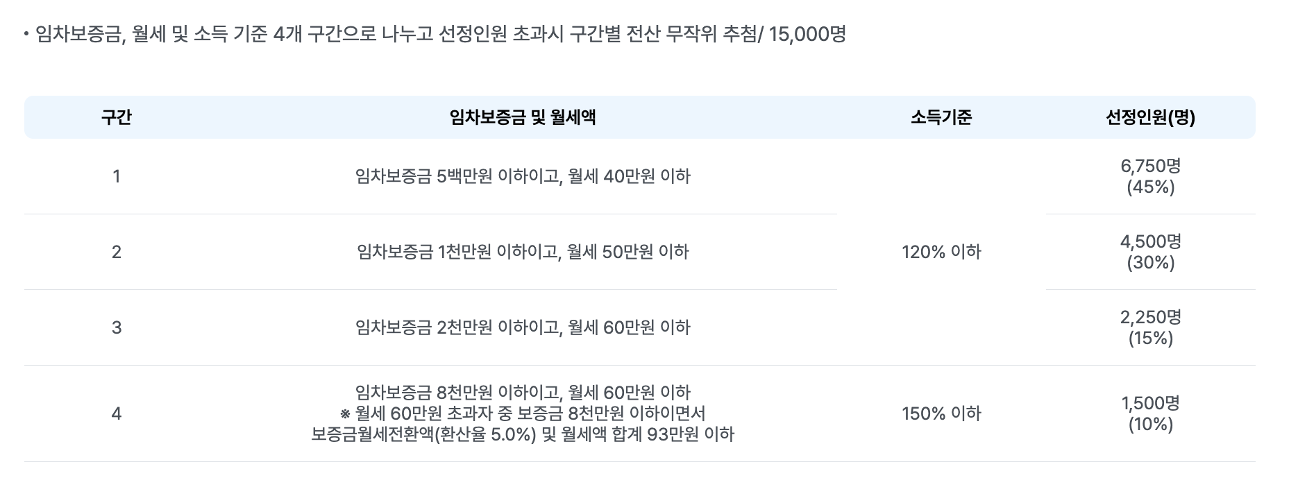 - 3구간: 보증금 2천만 원 이하 + 월세 60만 원 이하 + 중위소득 150% 이하 (15%)